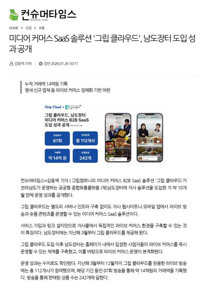 미디어 커머스 SaaS 솔루션 '그립 클라우드', 남도장터 도입 성과 공개