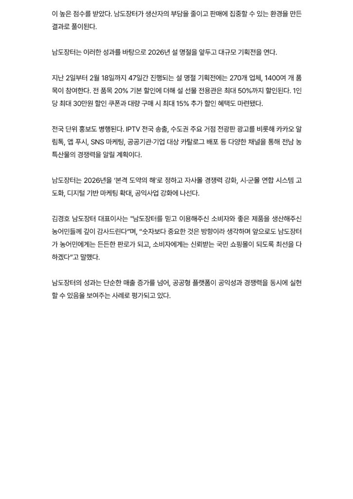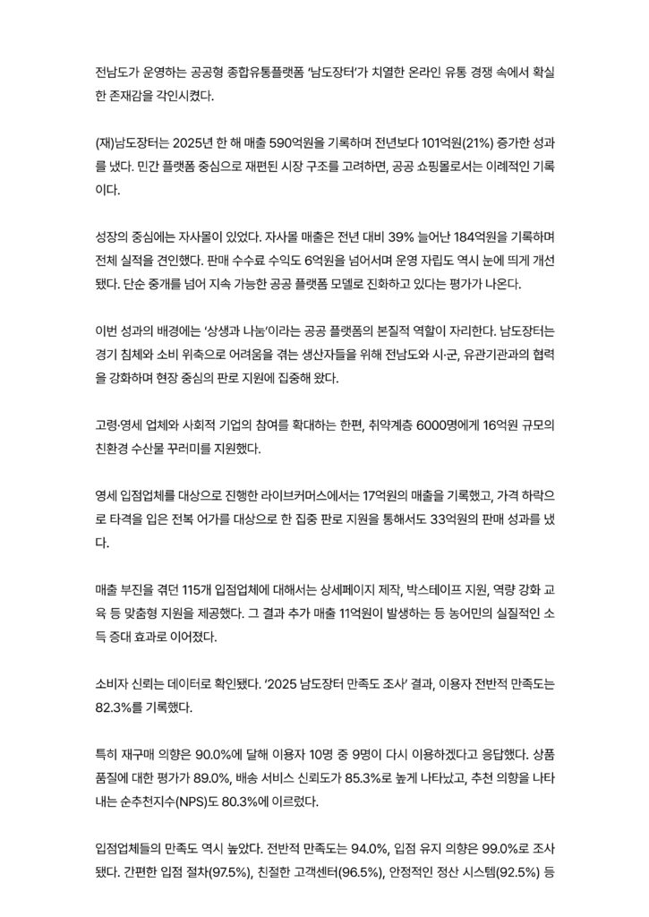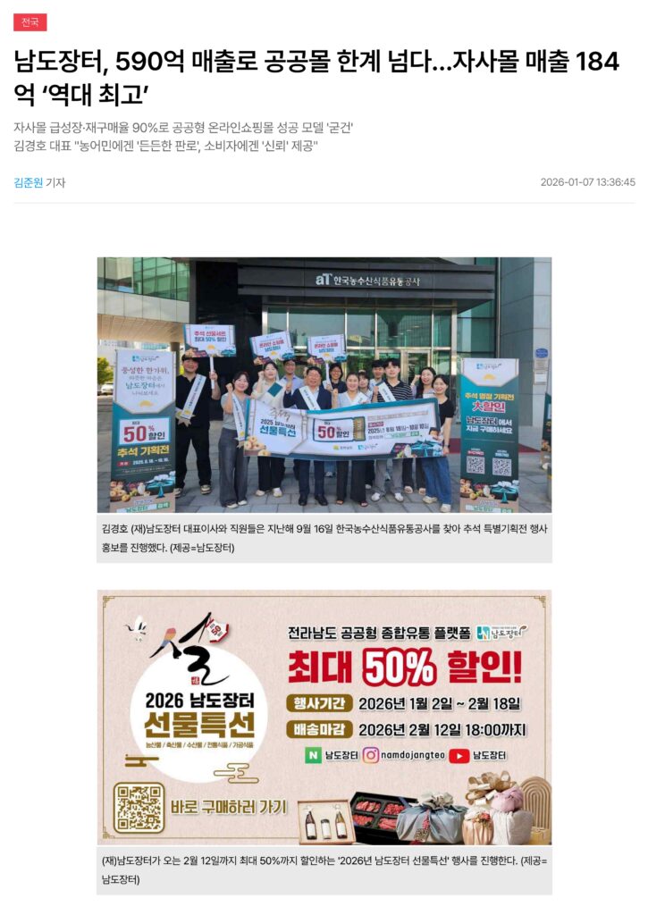 남도장터, 590억 매출로 공공몰 한계 넘다…자사몰 매출 184억 ‘역대 최고’
