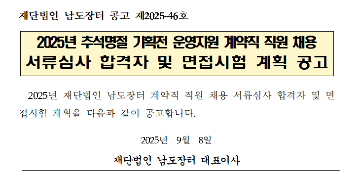 2025년 추석명절 기획전 운영지원 계약직 직원 채용 서류심사 합격자 및 면접시험 계획 공고